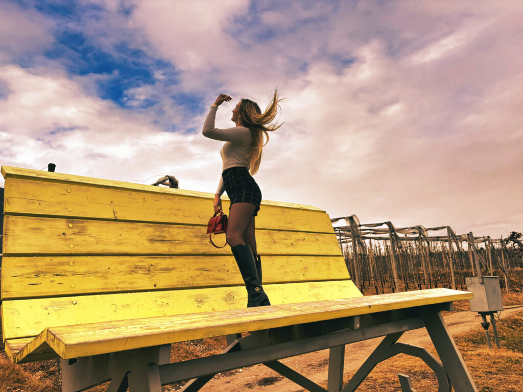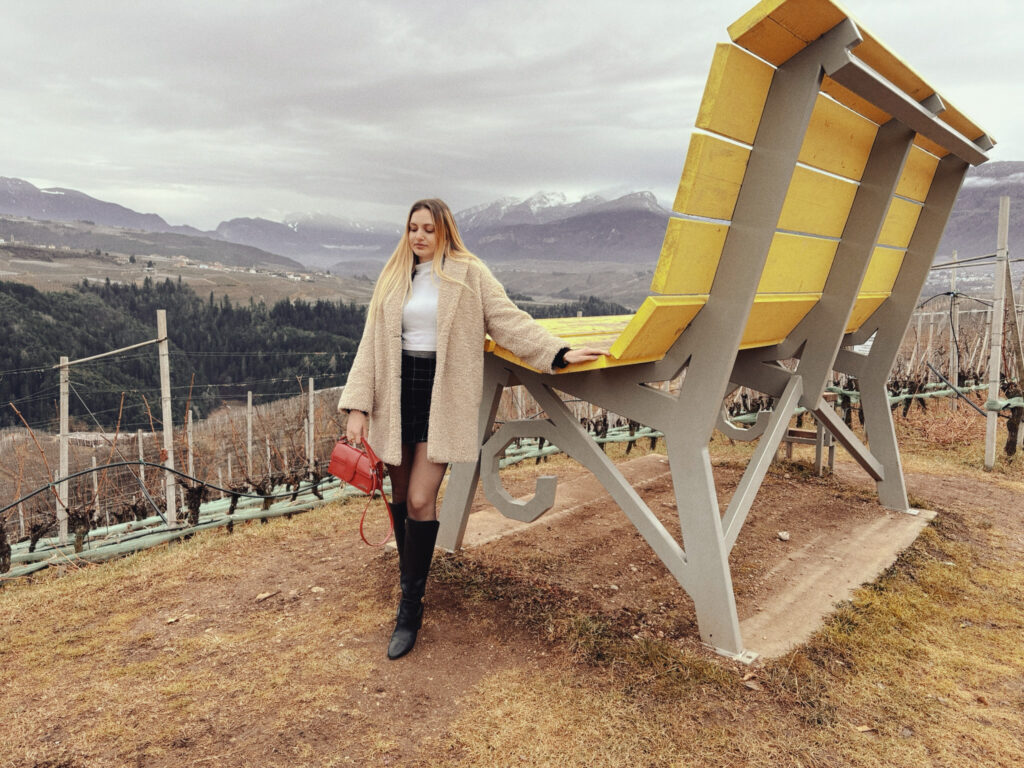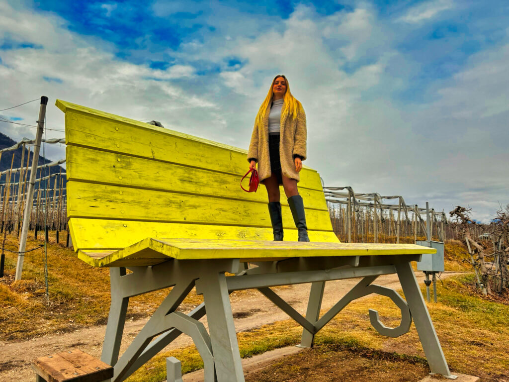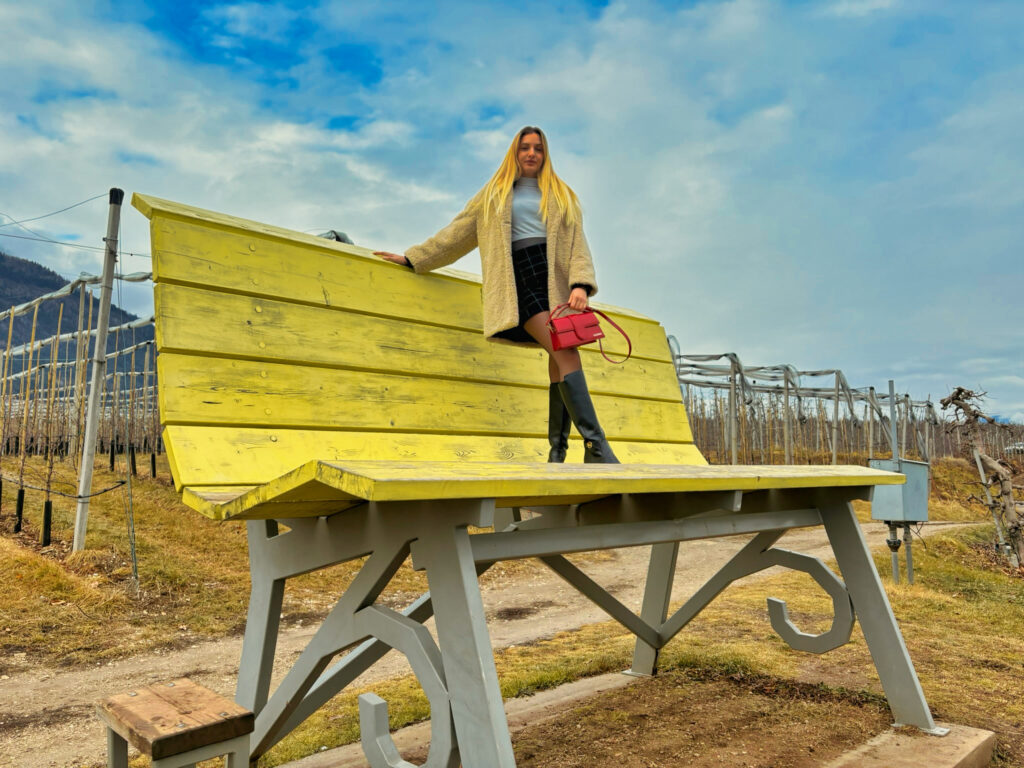 Tra i filari di Groppello, pausa creativa sulla panchina gialla di due metri e mezzo, che regala una vista mozzafiato sulla Val di Non, il lago di Santa Giustina e le Dolomiti di Brenta 🌄✨ Questa panchina, parte del progetto Big Bench Community Project ideato da Chris Bangle, è stata voluta dalla Cantina LasteRosse per valorizzare il pregiato vitigno autoctono Groppello e le eccellenze del territorio 🇮🇹🍇